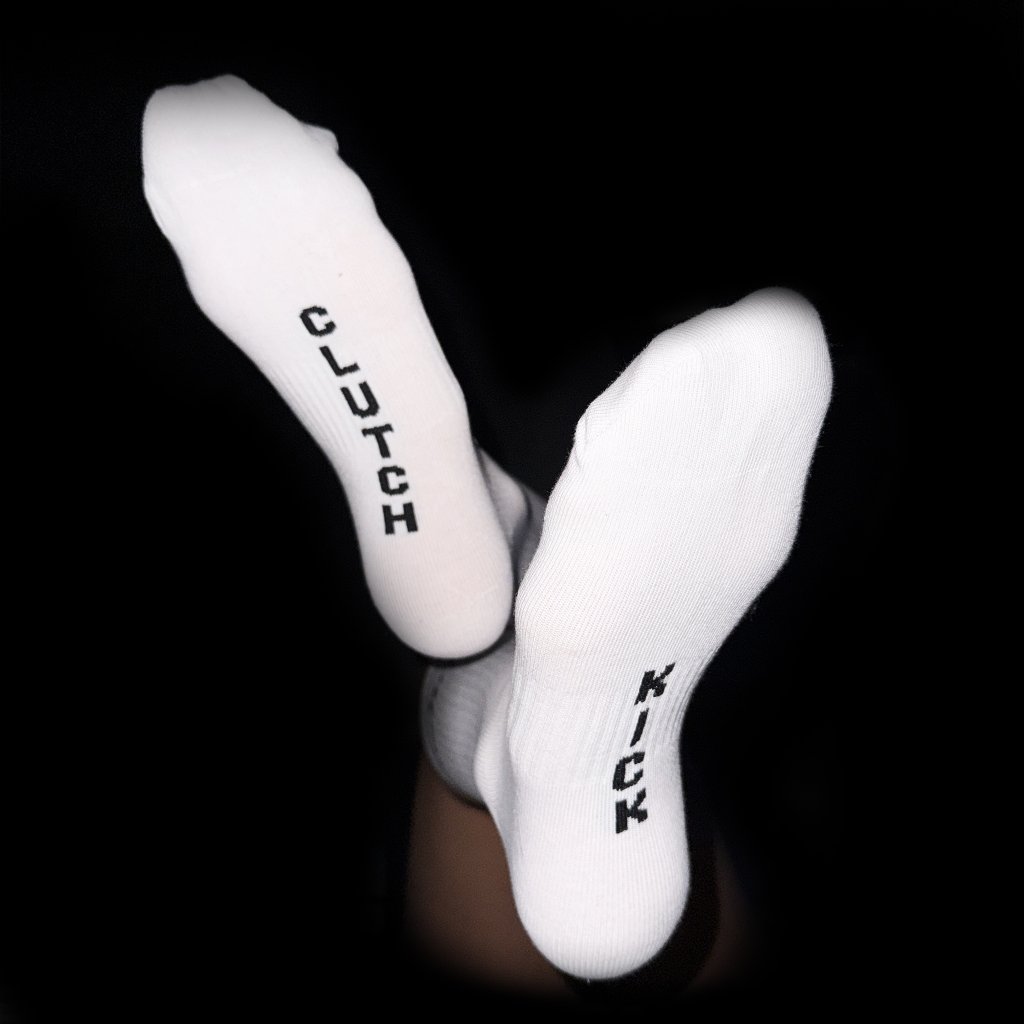 Ponožky pro ty, co ví, co znamená clutch-kick. Na boku logo Fueltra nápis – ale to hlavní je dole: levá CLUTCH, pravá KICK (strany si tedy snad nezpleteš).